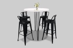 Hairpin Round White High Table, Black Legs for rent in Dubai, Abu Dhabi, UAE, GCC. This cocktail table is great for exhibitions, outdoor events, cocktail parties. Pair with the Pauchard Metal Bar Stool – White for the perfect set up. Also available as a COFFEE TABLE and as a DINING TABLE. Contact us now to order the Hairpin Round White High Table, Black Legs or for any other event furniture need or visit our INSTAGRAM page for set up inspiration.
