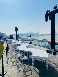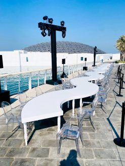 The Dauphin Ghost Acrylic Armchair is available for rent in Dubai, Abu Dhabi and UAE. This clear acrylic chair is perfect for weddings, conferences, exhibitions and private events. Pair with the Braun Rectangular Pallet Dining Table for that unique set up. Contact us now to order the Dauphin Ghost Acrylic Armchair or for any other event furniture need.