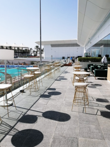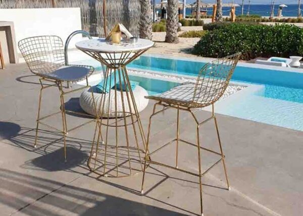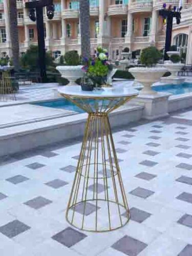 Fontana Gold Cocktail Table – White Top is available for rent in Dubai, Abu Dhabi, UAE, GCC. This high table, with its elegant design, is perfect for VIP events, gala events, cocktail parties or even just private parties. Pair with the Fiora Gold Bar Stool for the perfect set up. Also available with BLACK TABLE TOP. Contact us now to order the Fontana Gold Cocktail Table – White Top or for any other event furniture need.
