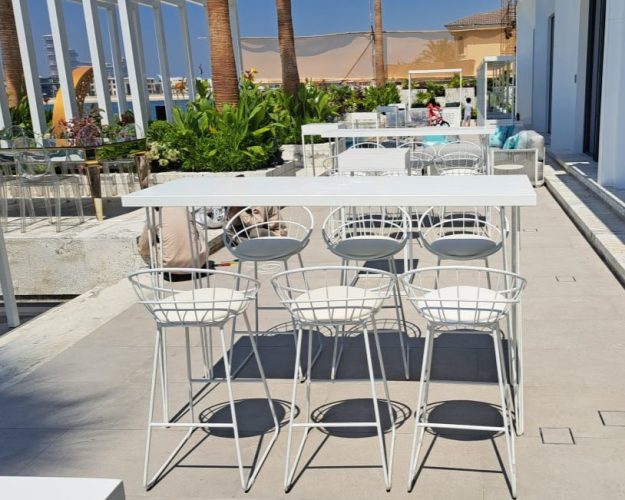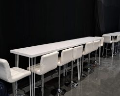 Hairpin Long White High Table for rent in Dubai, Abu Dhabi, UAE, GCC. This bar table, with its white wooden table top and white hairpin legs, is perfect for large gatherings as it can sit up to 8 people. Pair with the Pauchard Metal Bar Stool – White for the perfect set up. Also available as a COFFEE TABLE. Contact us now to order the Hairpin Long Cocktail Table, White or for any other event furniture need or visit our INSTAGRAM page for set up inspiration.