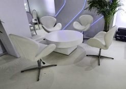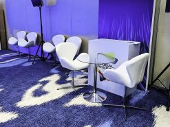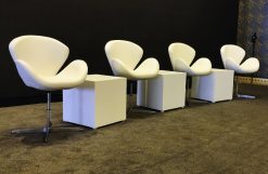 The Lotus Chair is available for rent in Dubai, Abu Dhabi and UAE for any event. This white leather chair with an adjustable seat cushion is perfect for exhibition, office set up and as a stage chair. Pair with the Colin Cube Table for the perfect set up. Contact us now to order the Lotus Chair or for any other event furniture need.