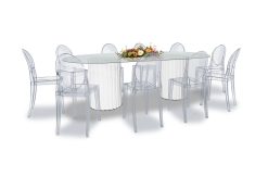 The Tuscany Oval Glass Dining Table is available for rent in Dubai, Abu Dhabi, UAE, GCC. This table is perfect for weddings, conferences, VIP events, gala events. Pair with the Dauphin Ghost Acrylic Chair for the perfect set up. Contact us now to order the Tuscany Oval Glass Dining Table or for any other event furniture need or visit our INSTAGRAM page for set up inspiration.