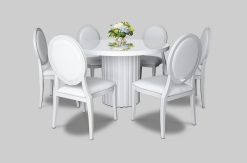 The Tuscany Round Dining Table is available for rent in Dubai, Abu Dhabi, UAE, GCC. This white wooden dining table can seat 4 people comfortably. Perfect for small and intimate set up for NYE, gala dinners, outdoor events, cafe set up. Pair with the Dior Dining Chair for the perfect set up. Contact us now to order the Tuscany Round Dining Table or for any other event furniture need or visit our INSTAGRAM page for set up inspiration.
