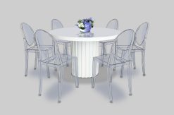 | Description | White wooden table base, clear tempered round glass table top, 4 to 6 seater |